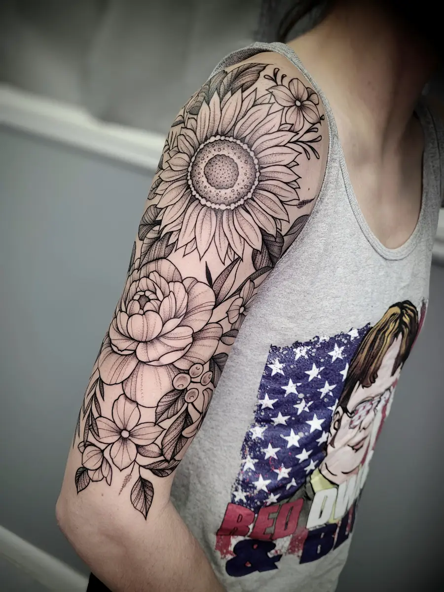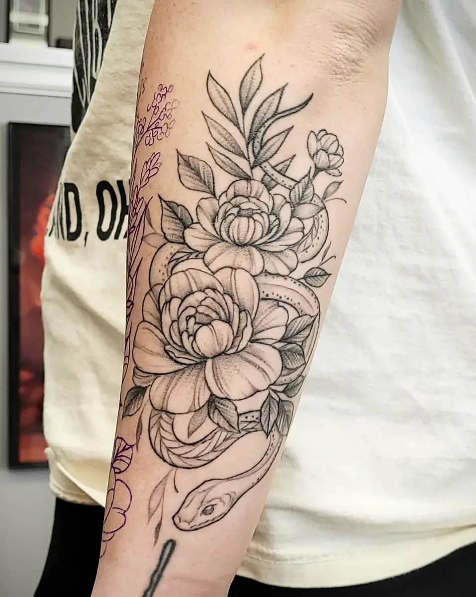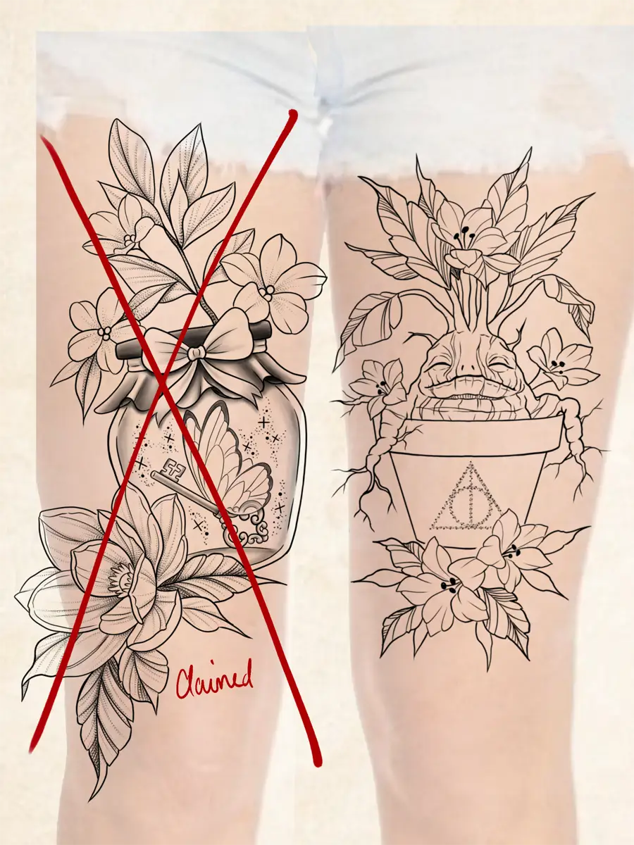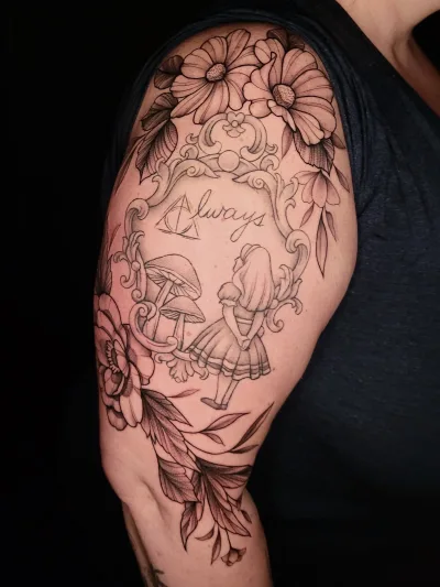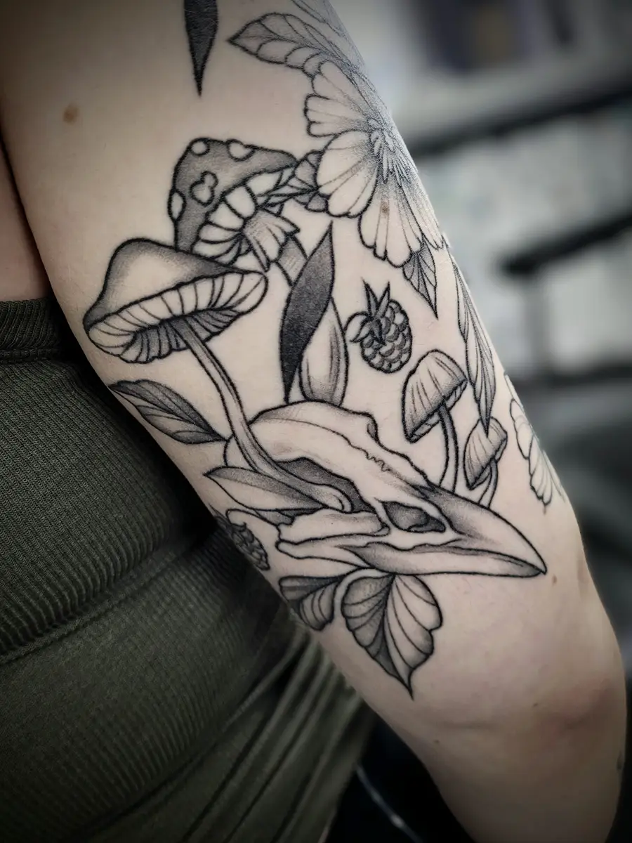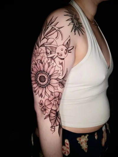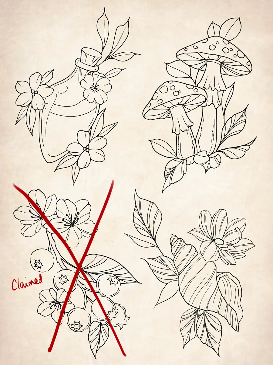 Sunshine’s focus is on large-scale floral/botanicals in her signature wispy style, as well as nerdy/gamer and witchy/fantasy projects, which she often incorporates into her floral pieces.