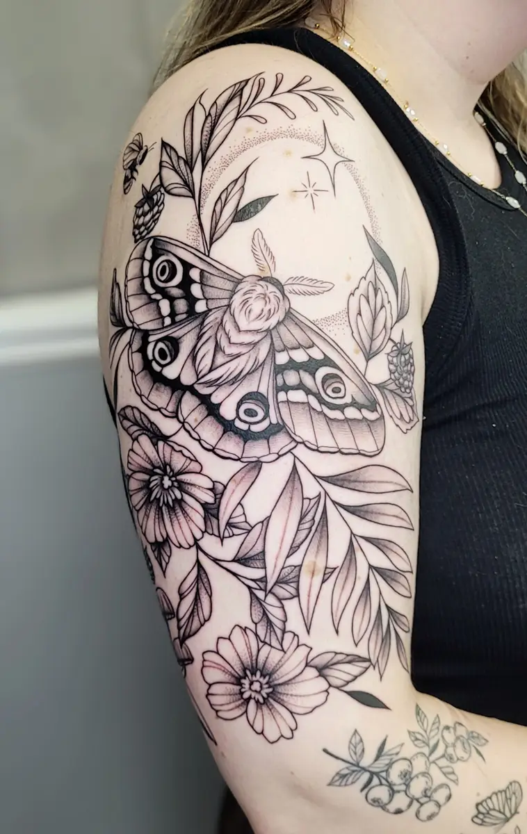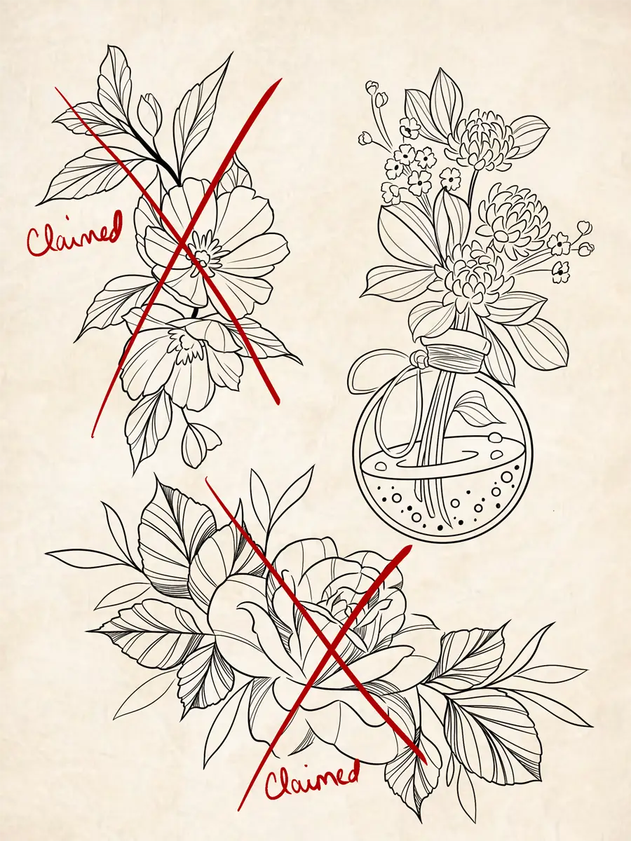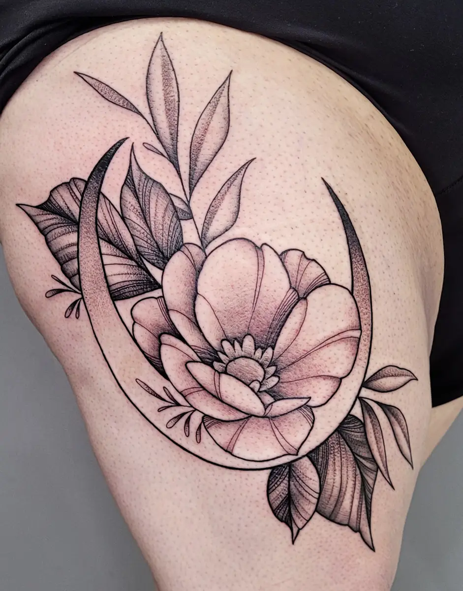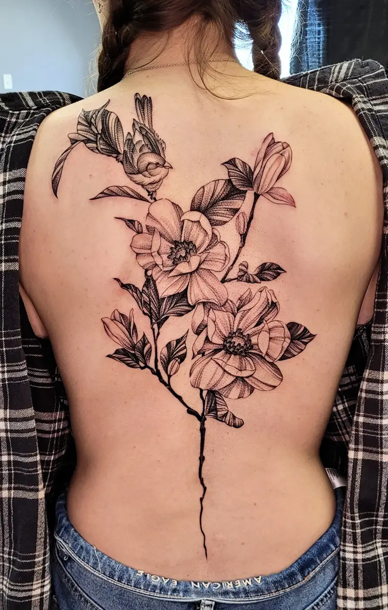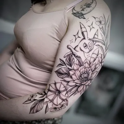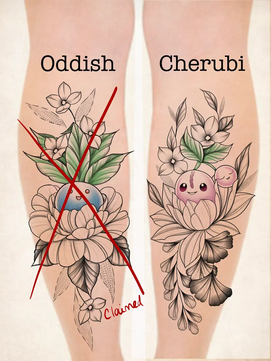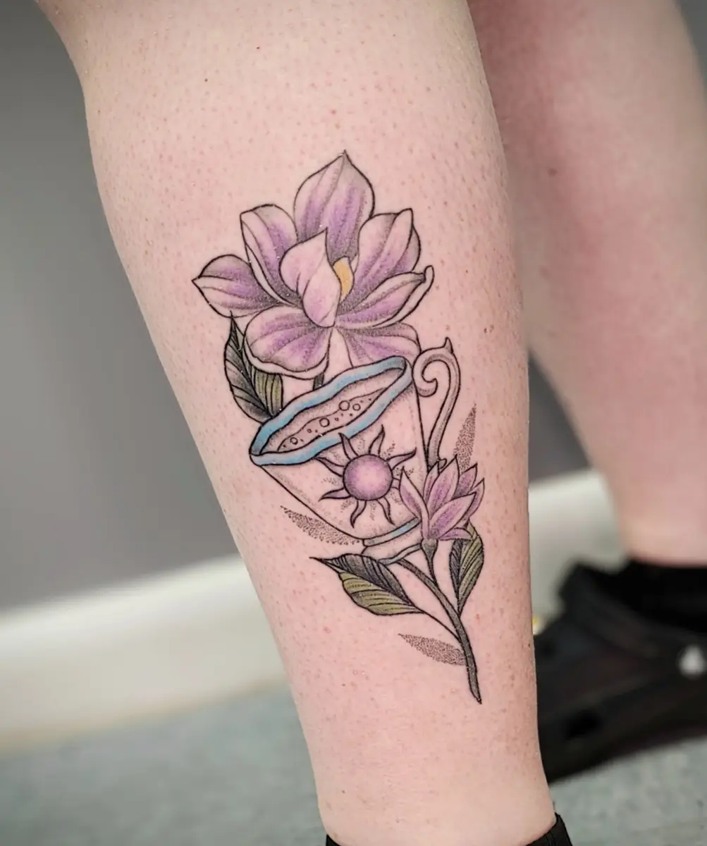 Sunshine’s focus is on large-scale floral/botanicals in her signature wispy style, as well as nerdy/gamer and witchy/fantasy projects, which she often incorporates into her floral pieces.