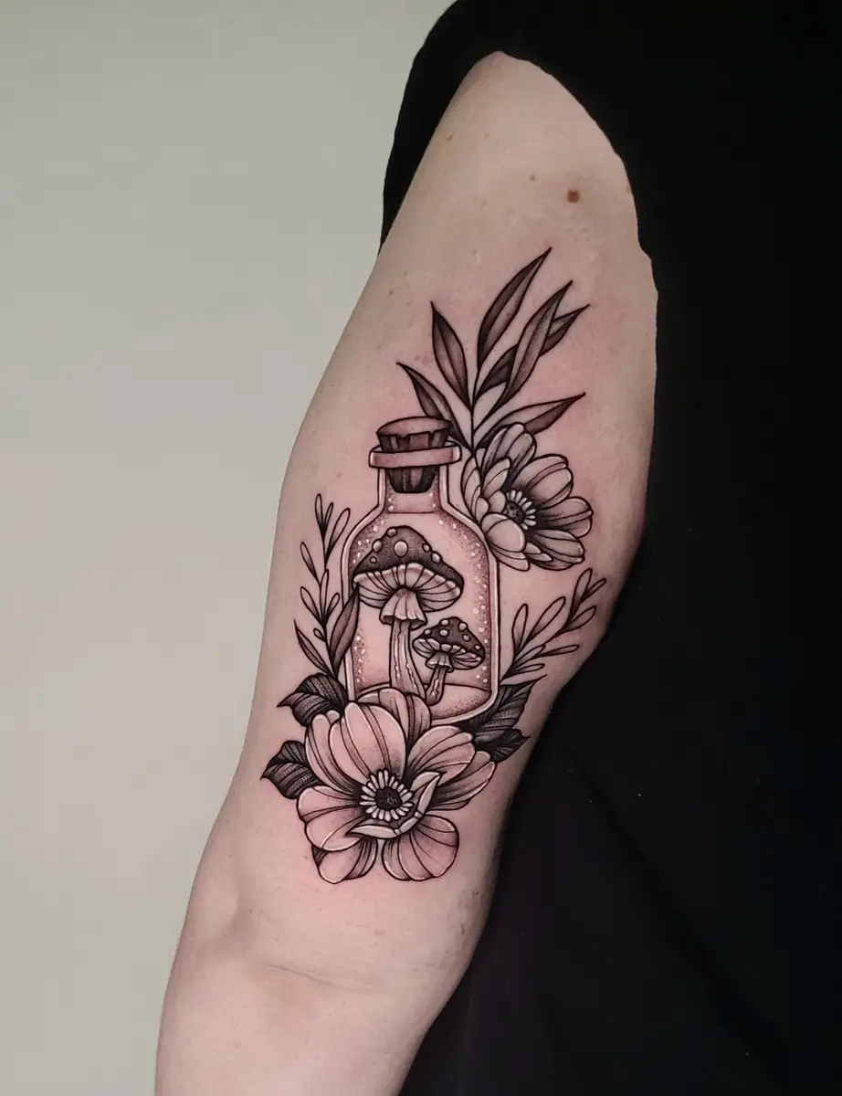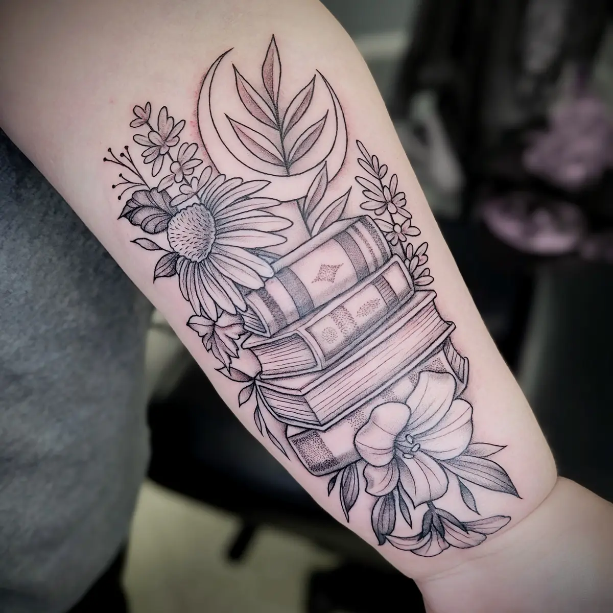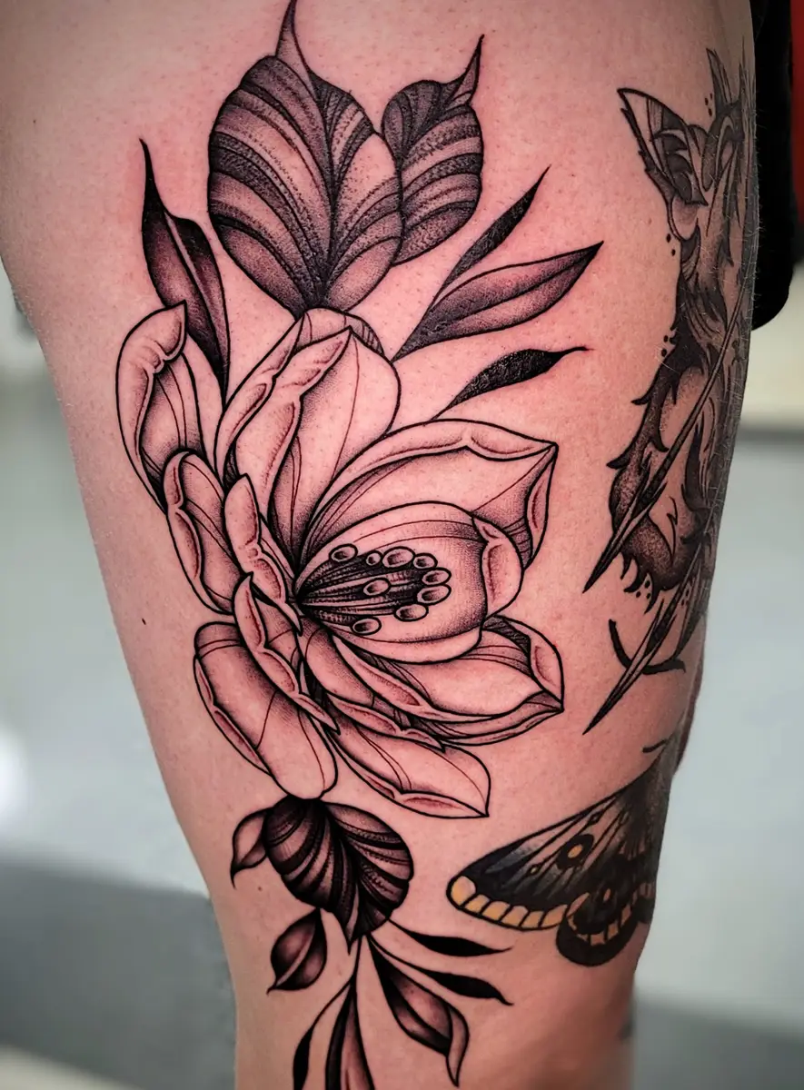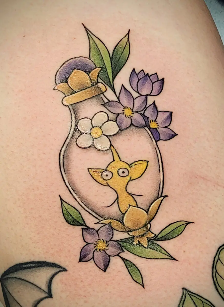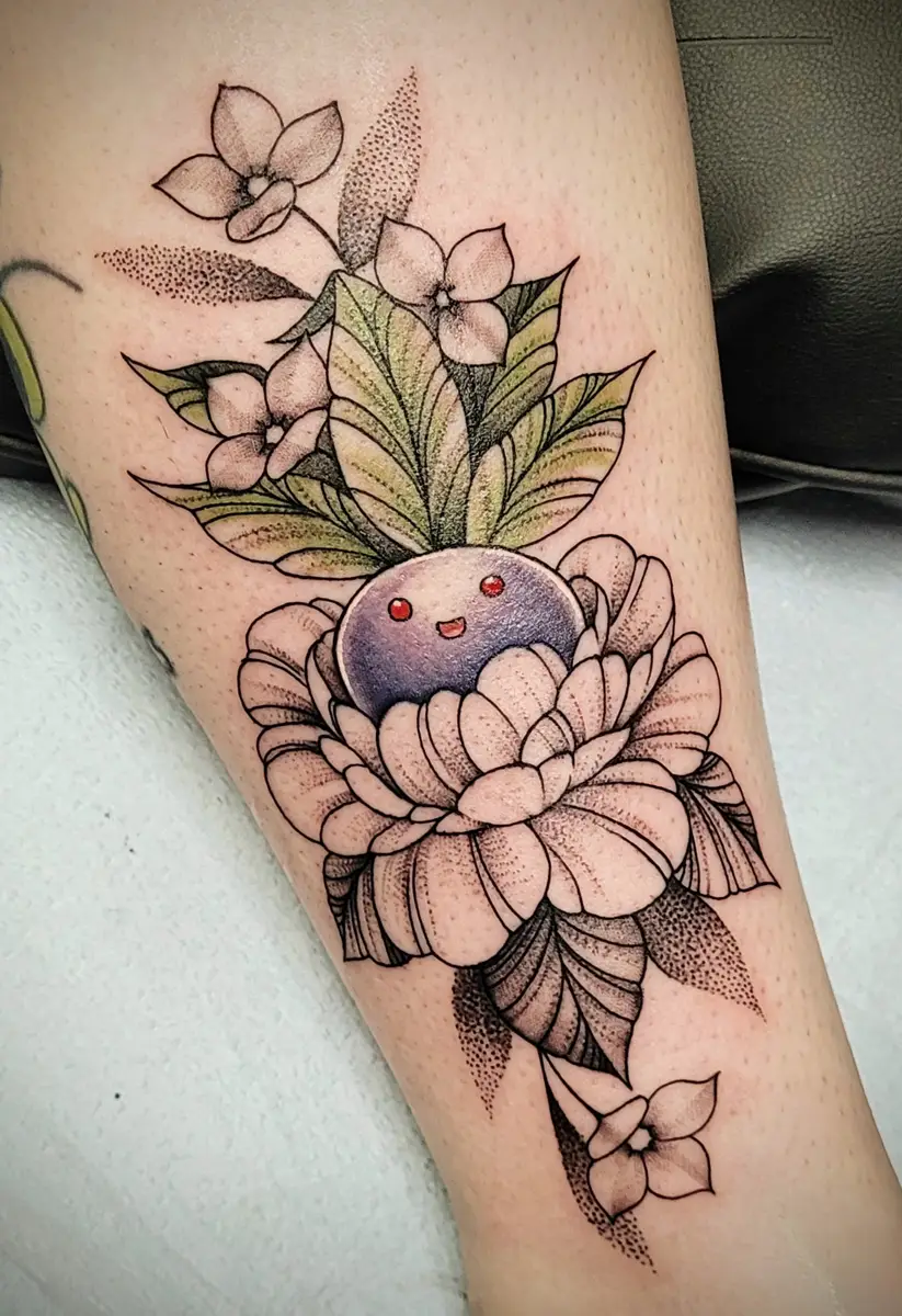 Sunshine’s focus is on large-scale floral/botanicals in her signature wispy style, as well as nerdy/gamer and witchy/fantasy projects, which she often incorporates into her floral pieces.