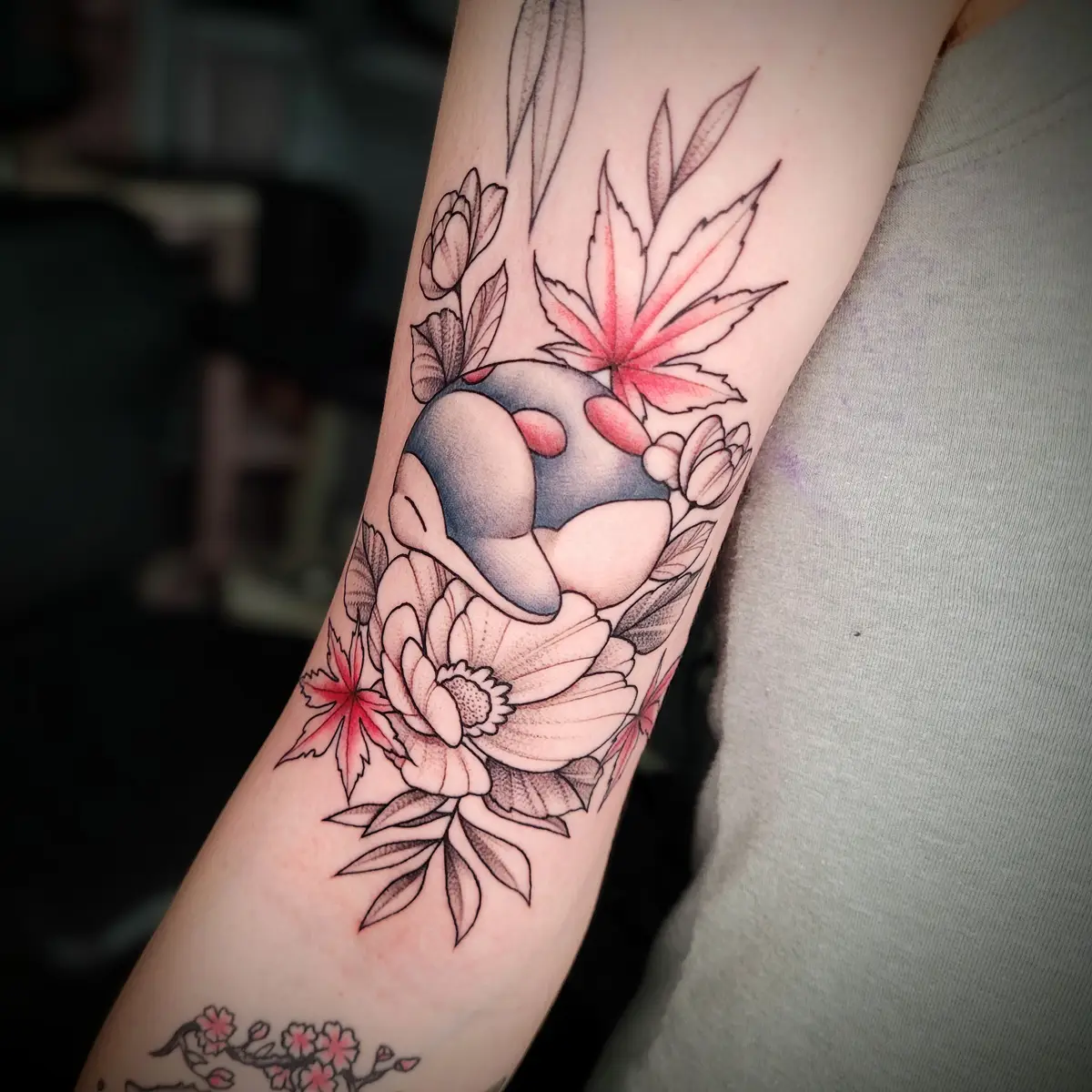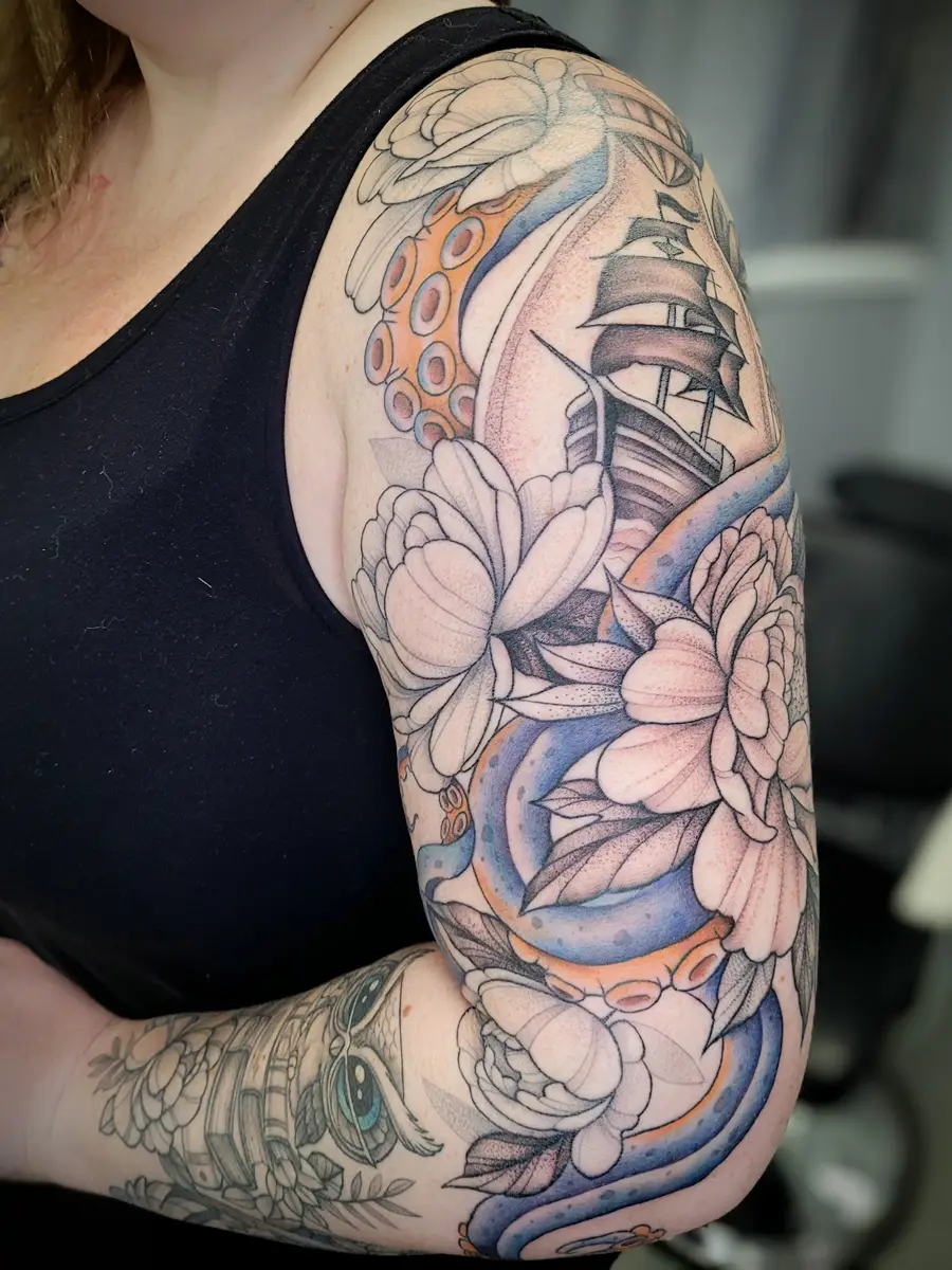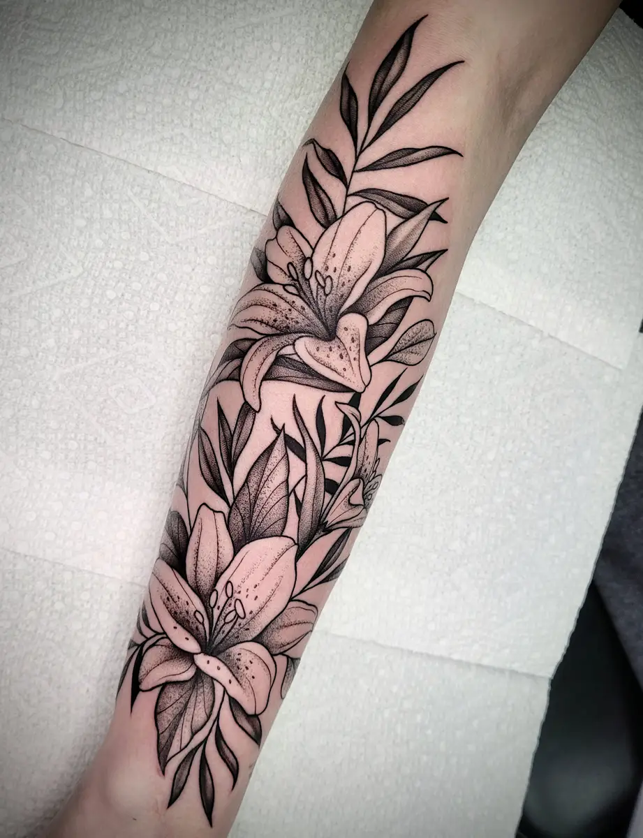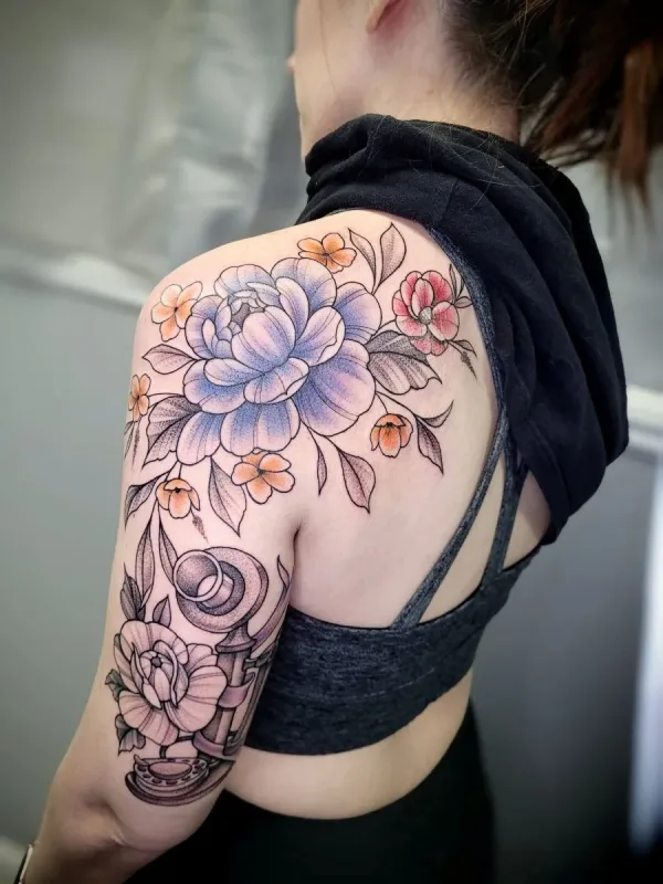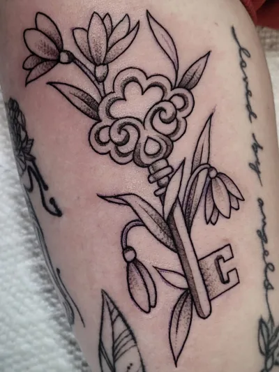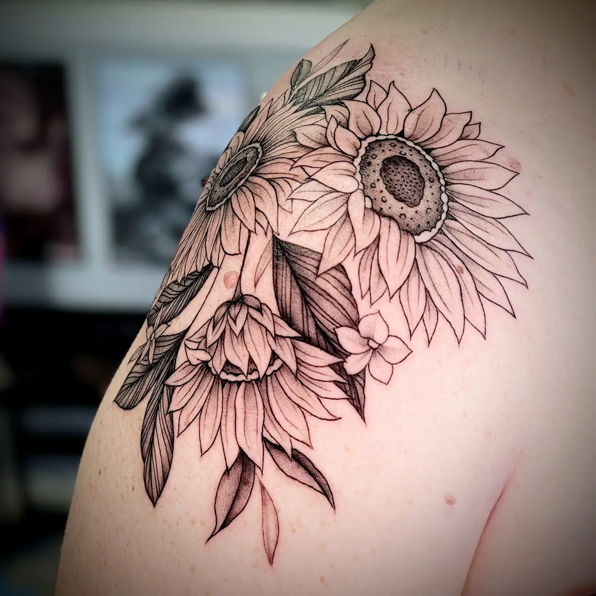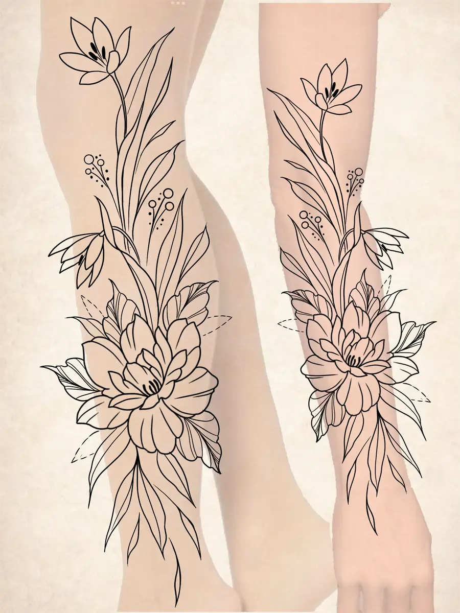 Sunshine’s focus is on large-scale floral/botanicals in her signature wispy style, as well as nerdy/gamer and witchy/fantasy projects, which she often incorporates into her floral pieces.