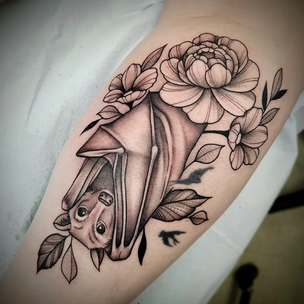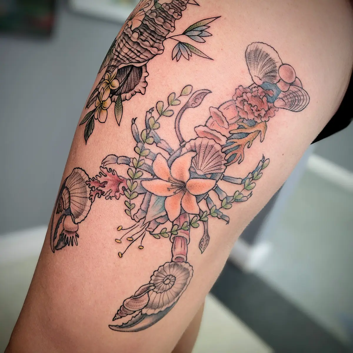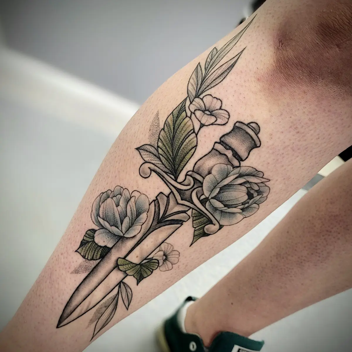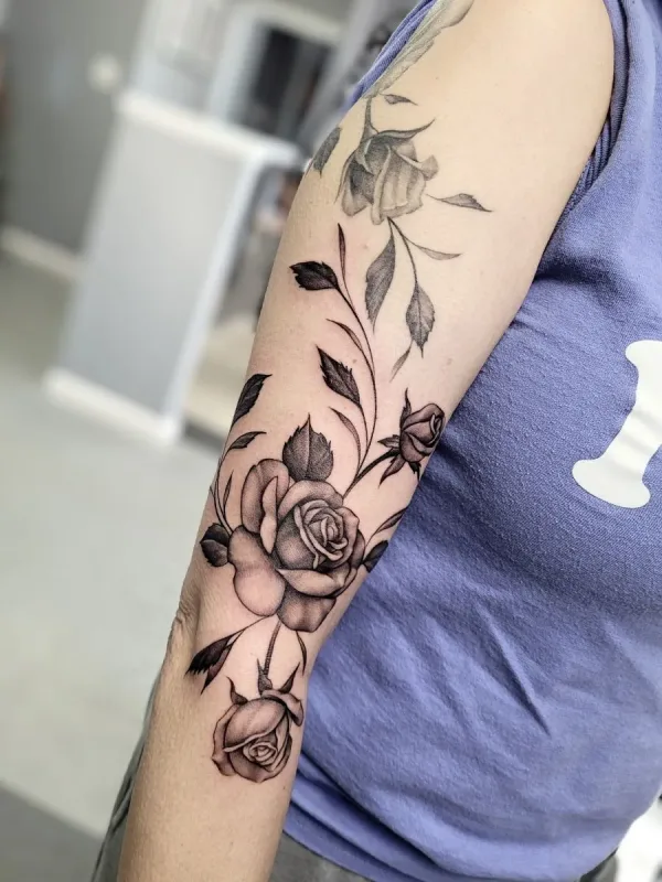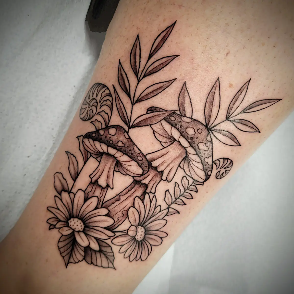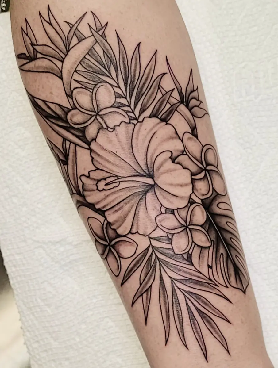 Sunshine’s focus is on large-scale floral/botanicals in her signature wispy style, as well as nerdy/gamer and witchy/fantasy projects, which she often incorporates into her floral pieces.