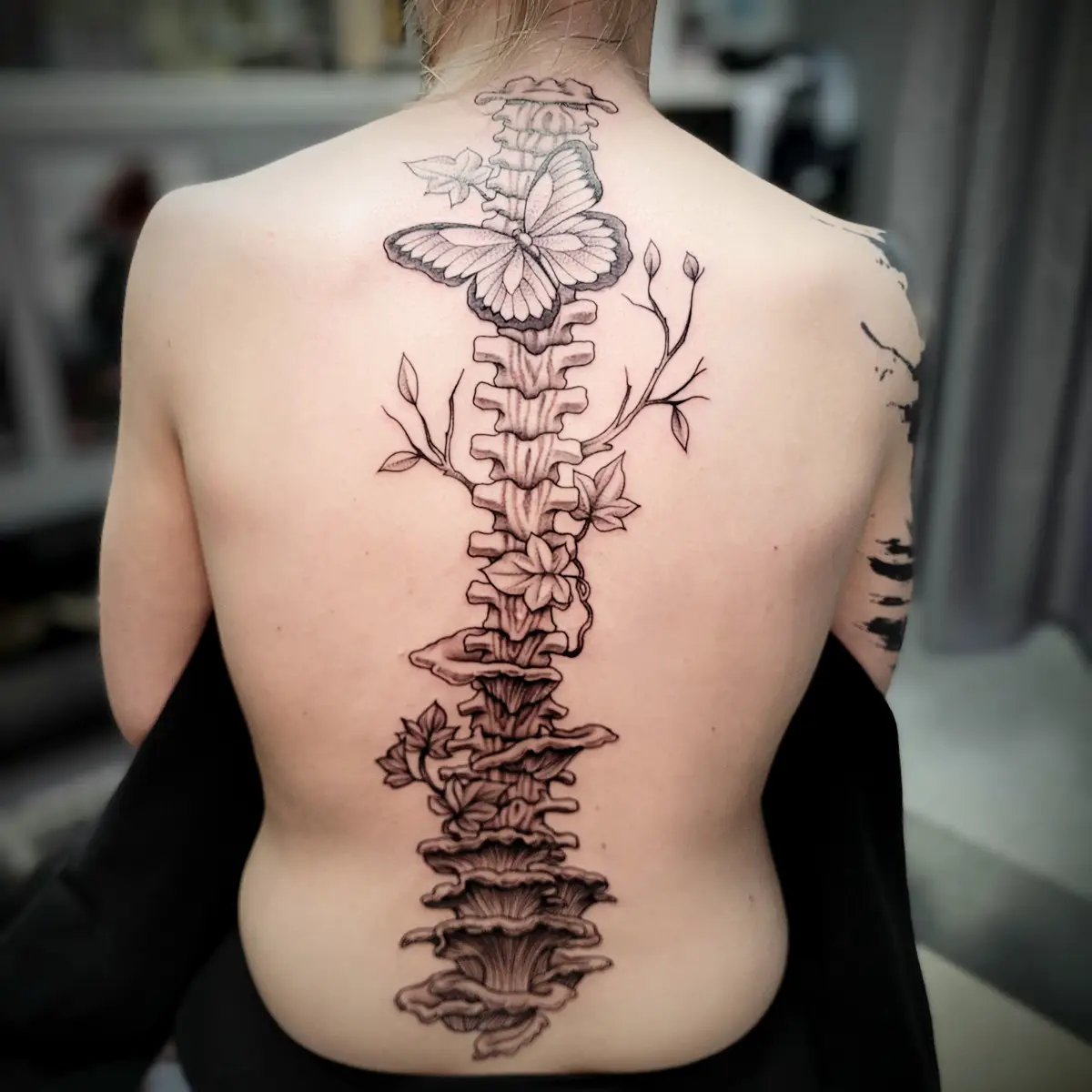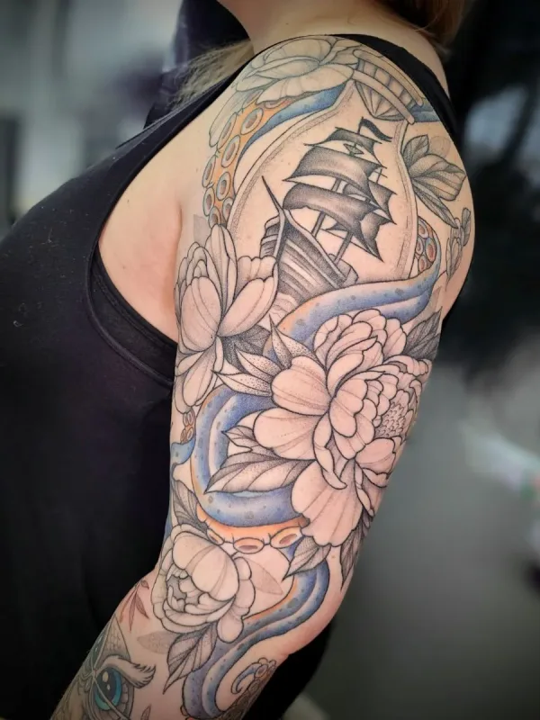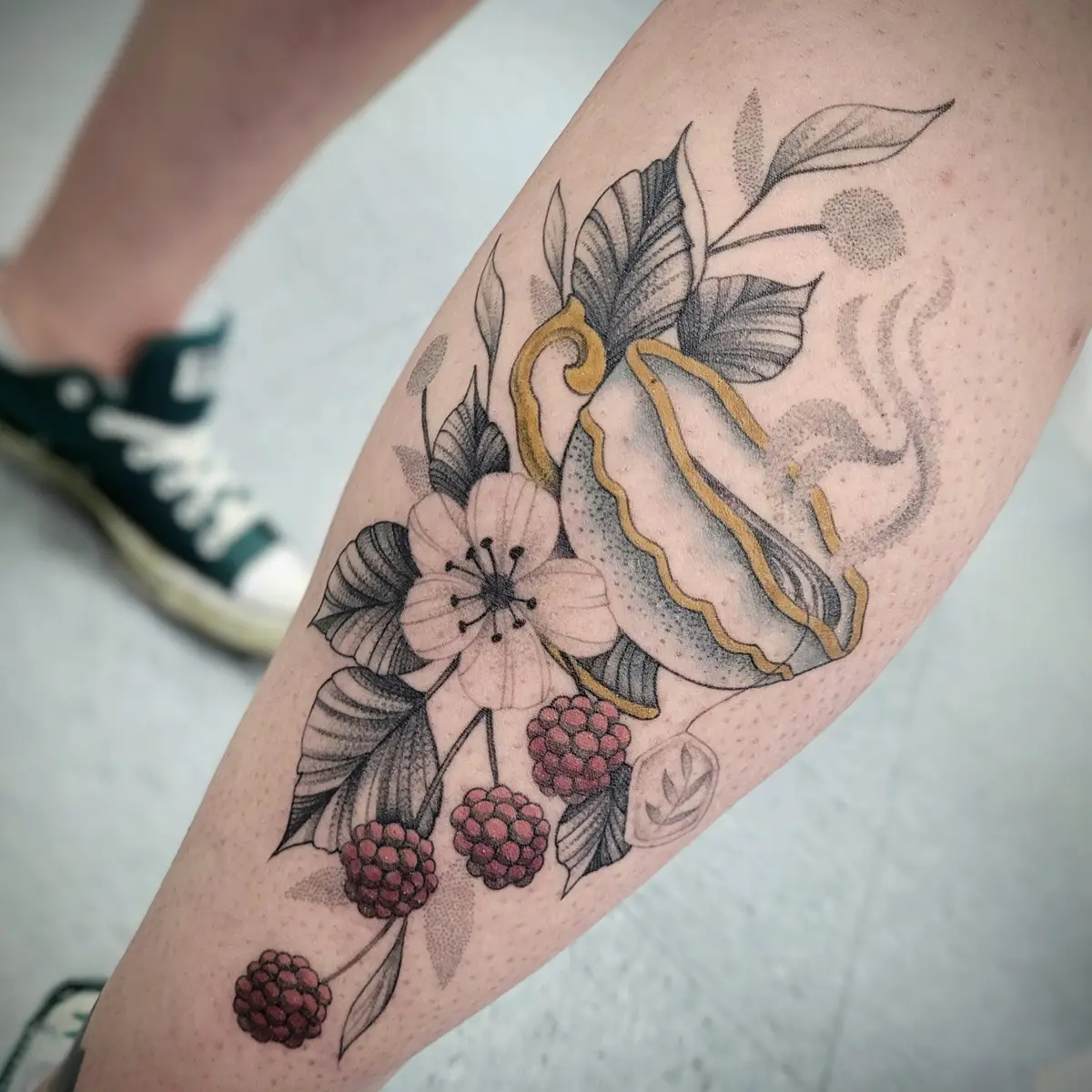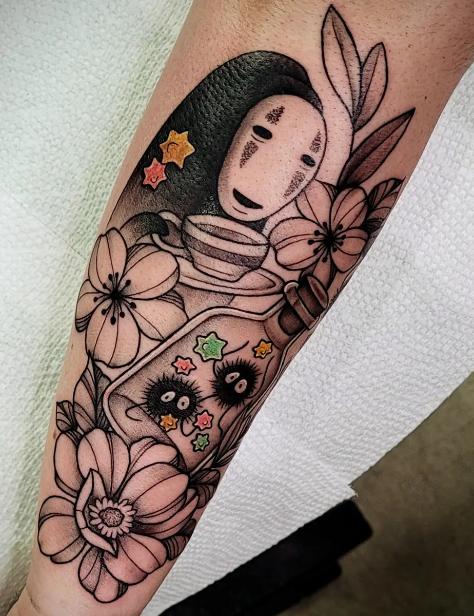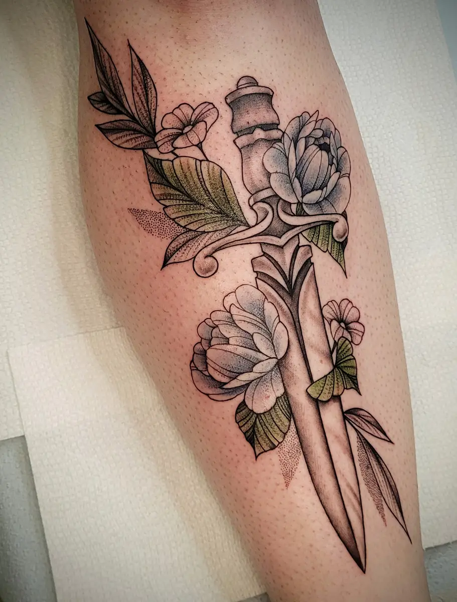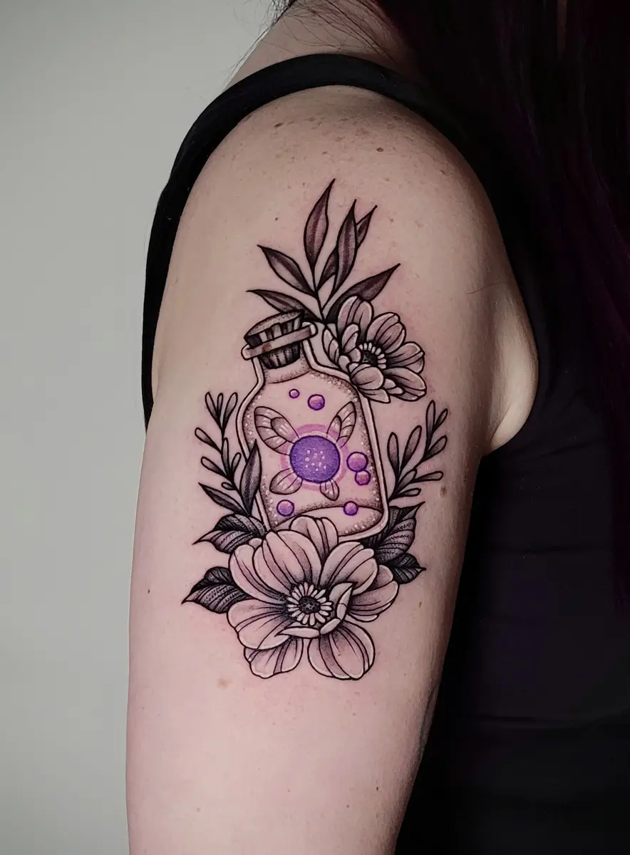 Sunshine’s focus is on large-scale floral/botanicals in her signature wispy style, as well as nerdy/gamer and witchy/fantasy projects, which she often incorporates into her floral pieces.