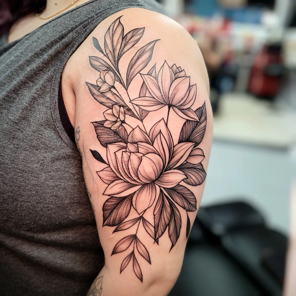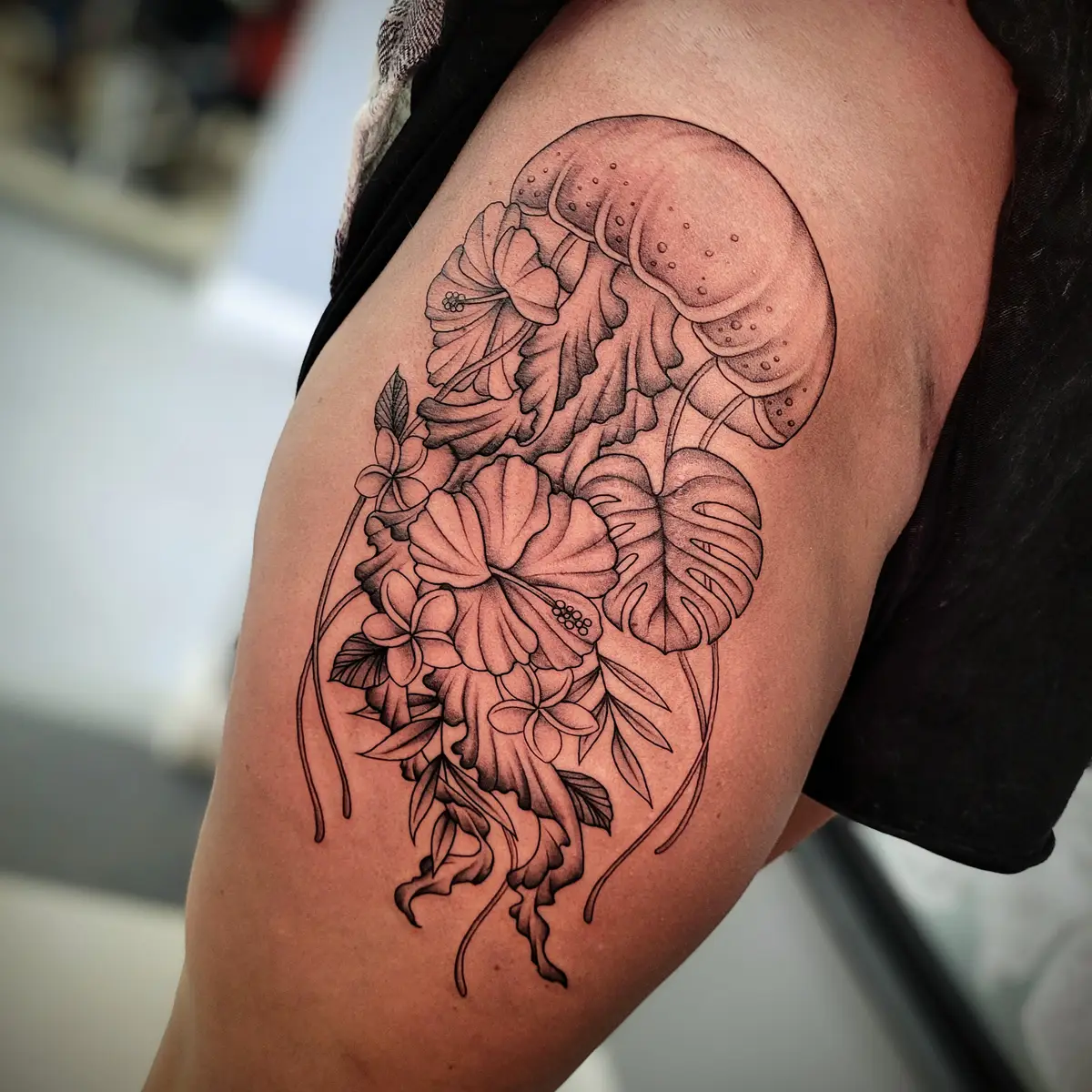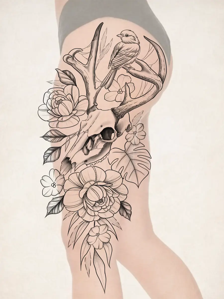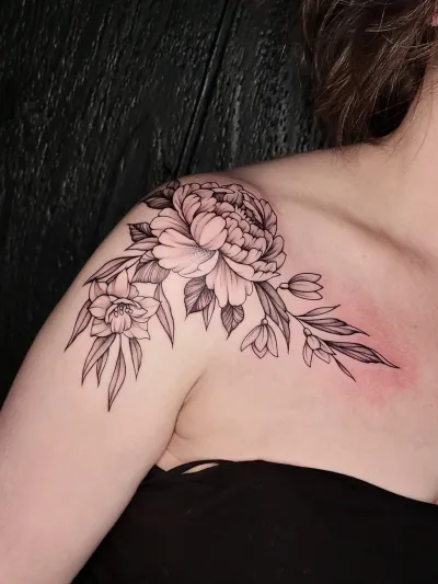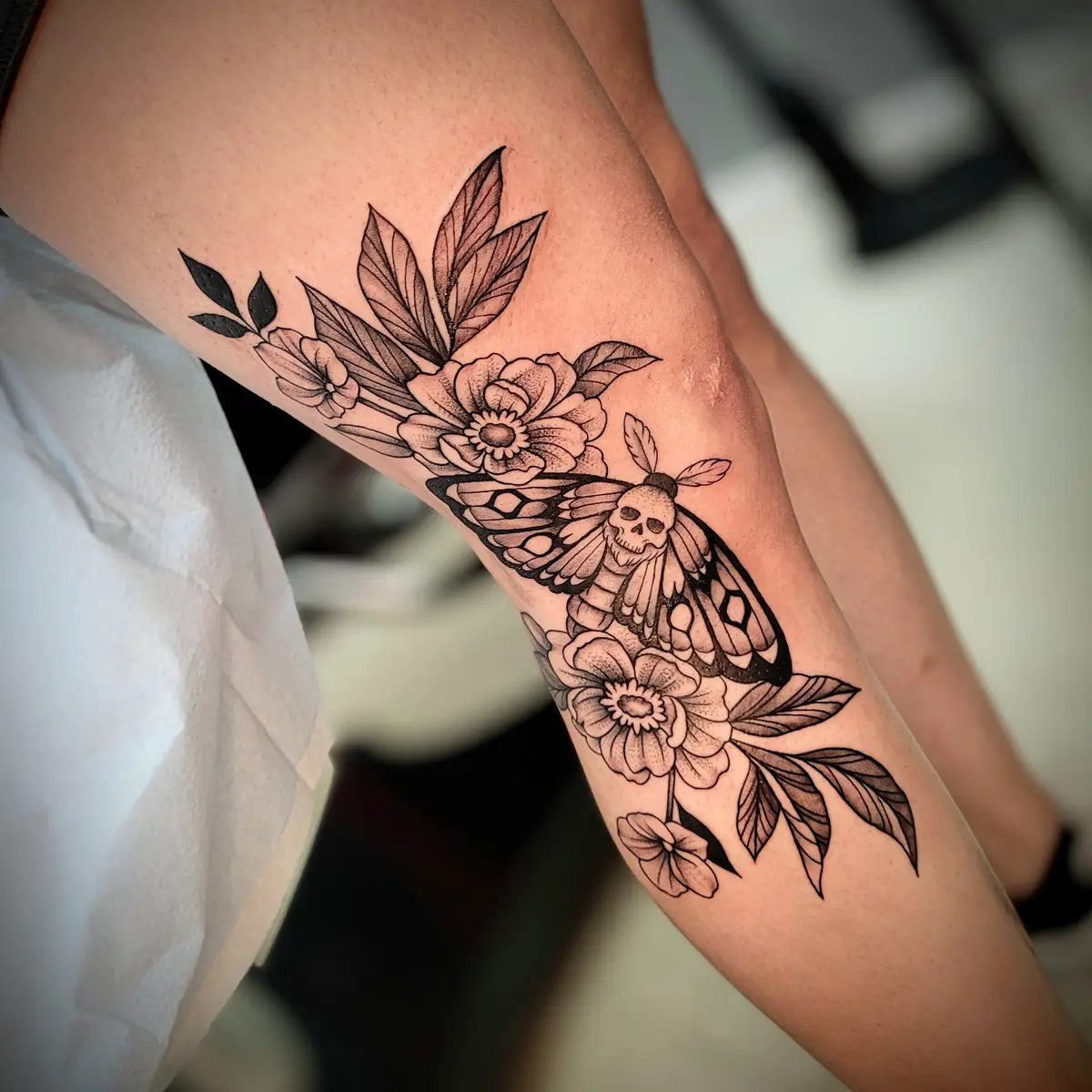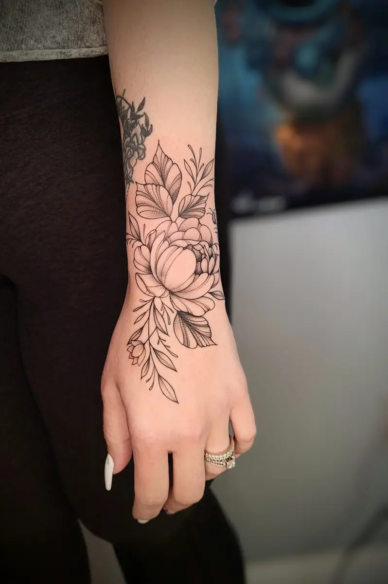 Sunshine’s focus is on large-scale floral/botanicals in her signature wispy style, as well as nerdy/gamer and witchy/fantasy projects, which she often incorporates into her floral pieces.