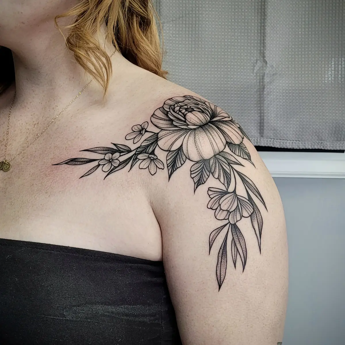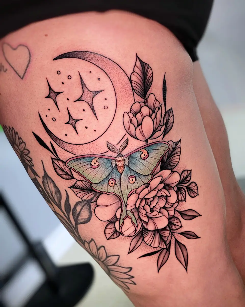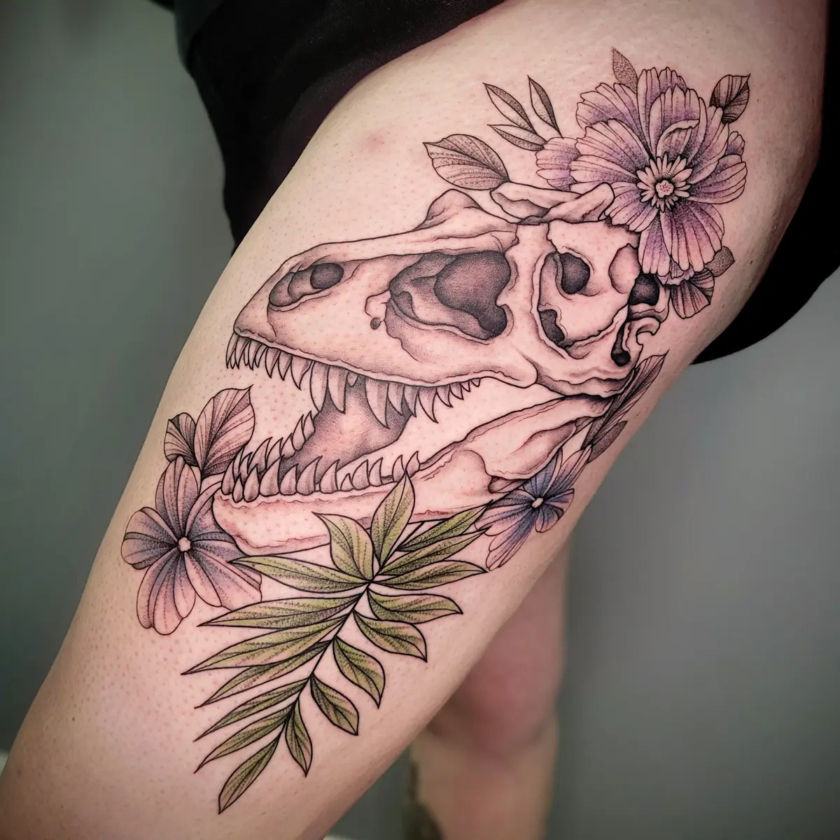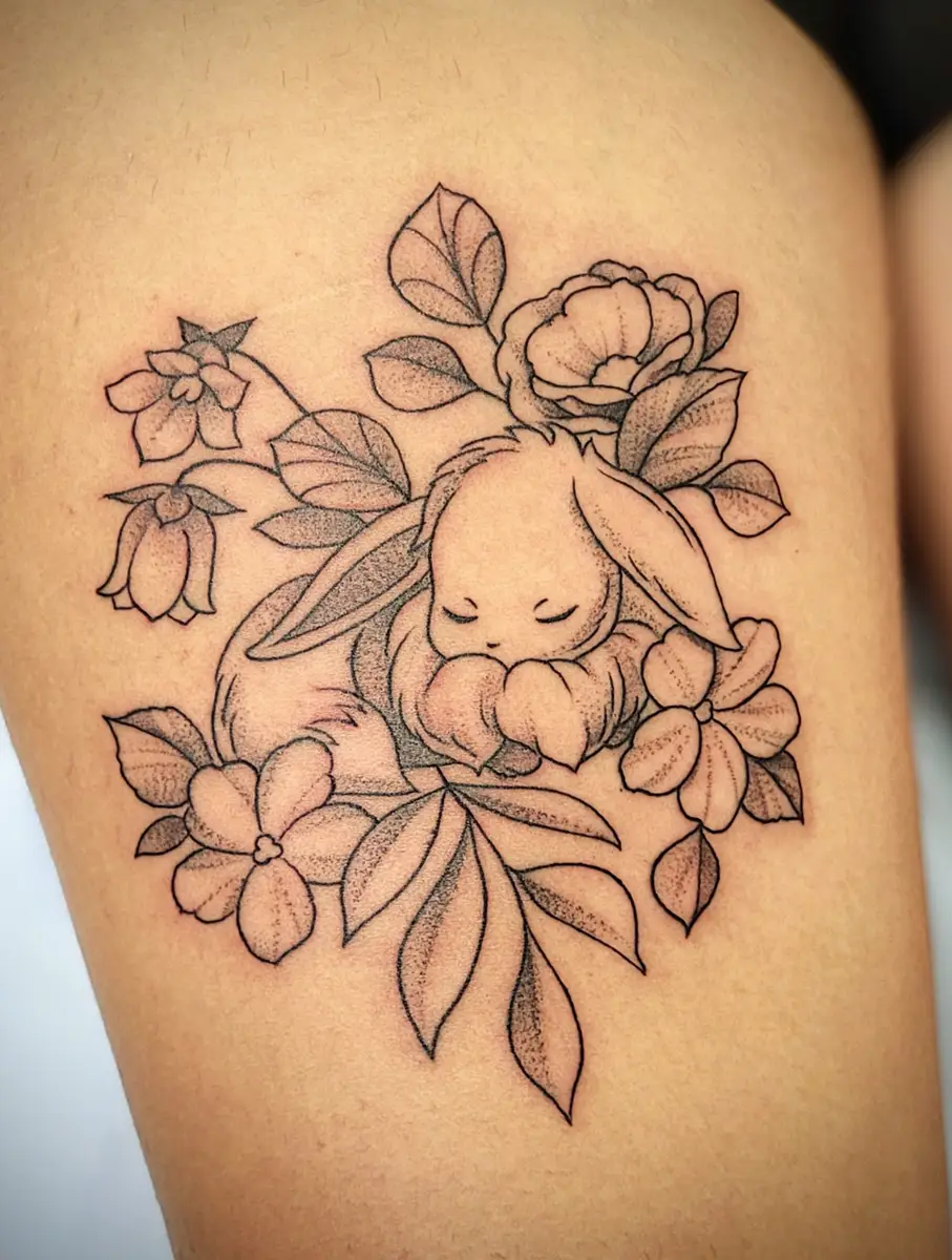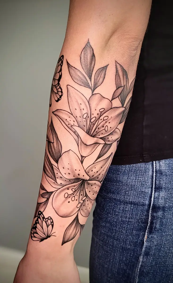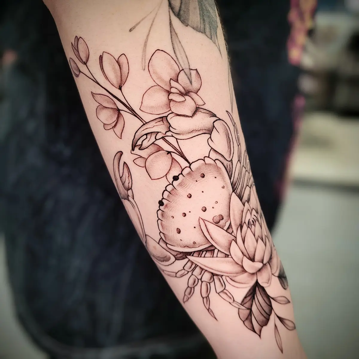 Sunshine’s focus is on large-scale floral/botanicals in her signature wispy style, as well as nerdy/gamer and witchy/fantasy projects, which she often incorporates into her floral pieces.